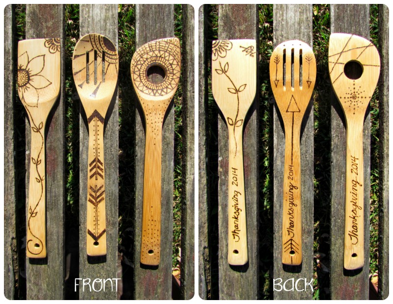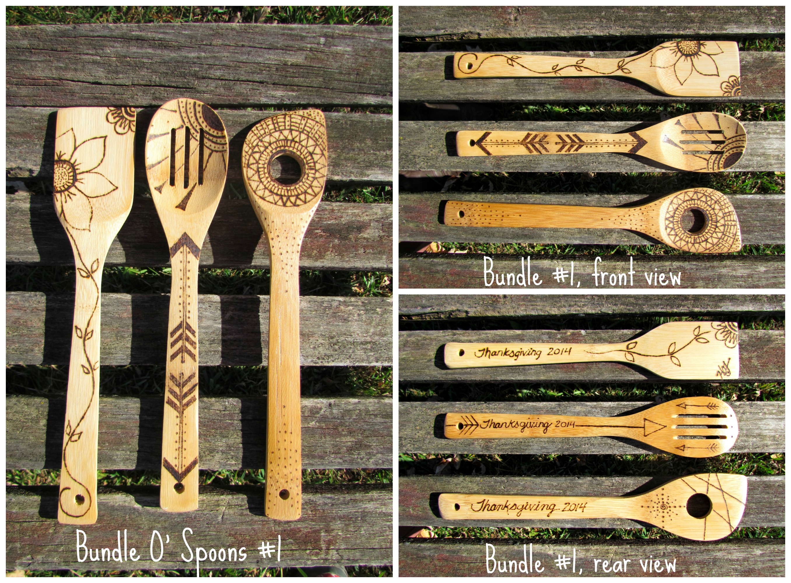 Add a little excitement to your daily meal preparations (or share some handcrafted goodness with someone you love) with these bamboo utensils. Each one is individually hand etched (burned) for a unique creation. “Thanksgiving 2014” is engraved on the reverse side of each piece. Bundles contain 3 utensils.