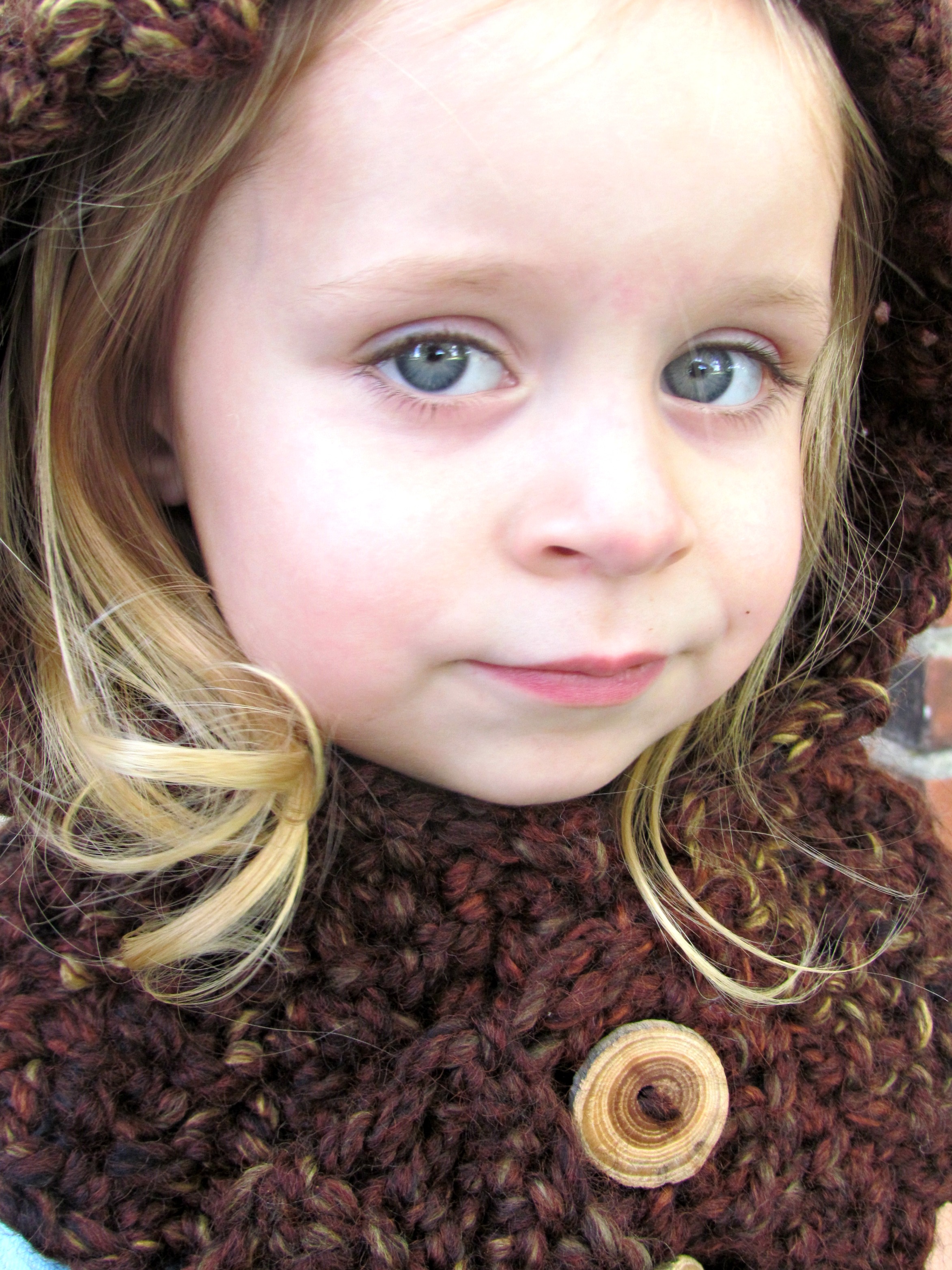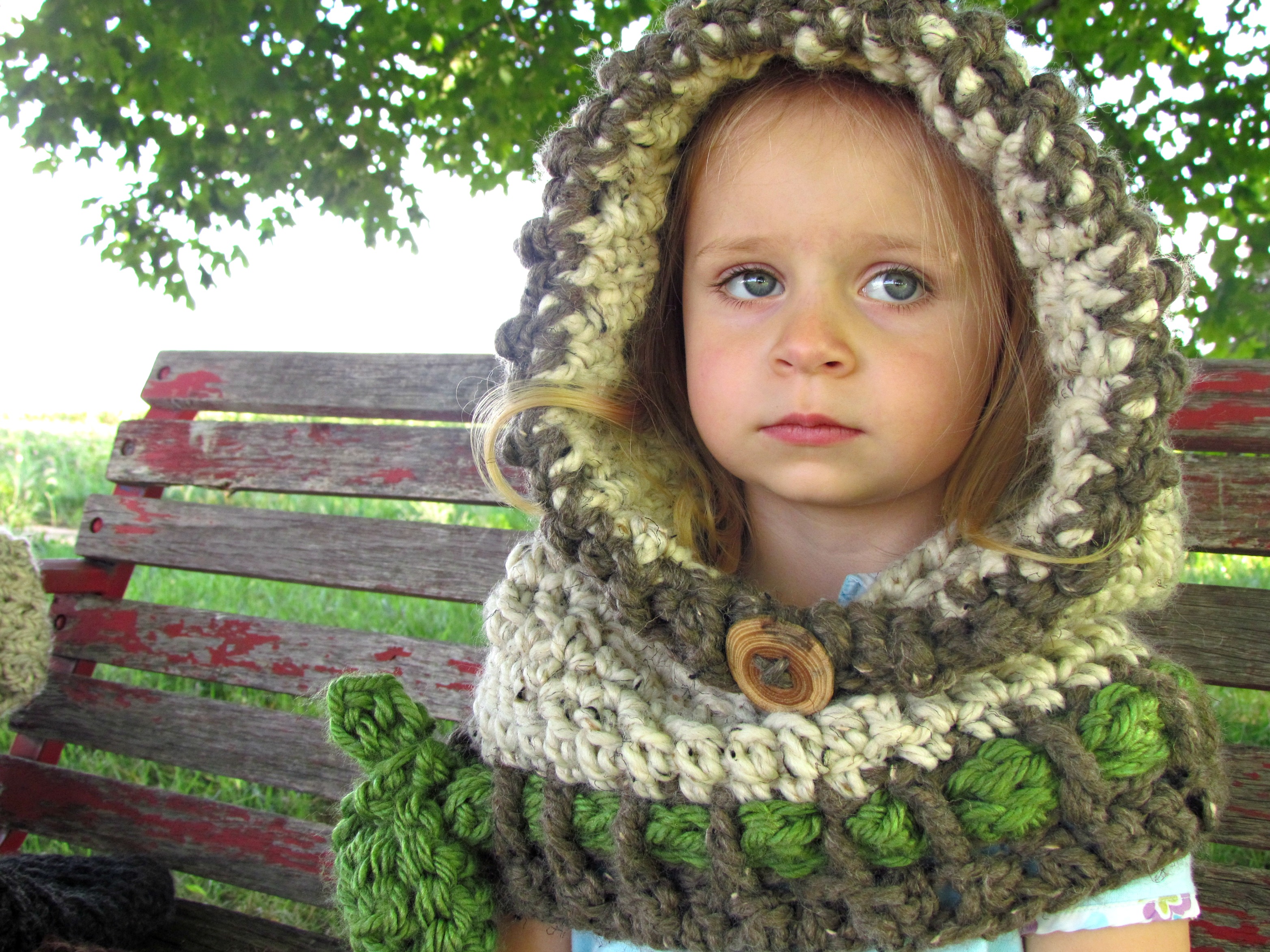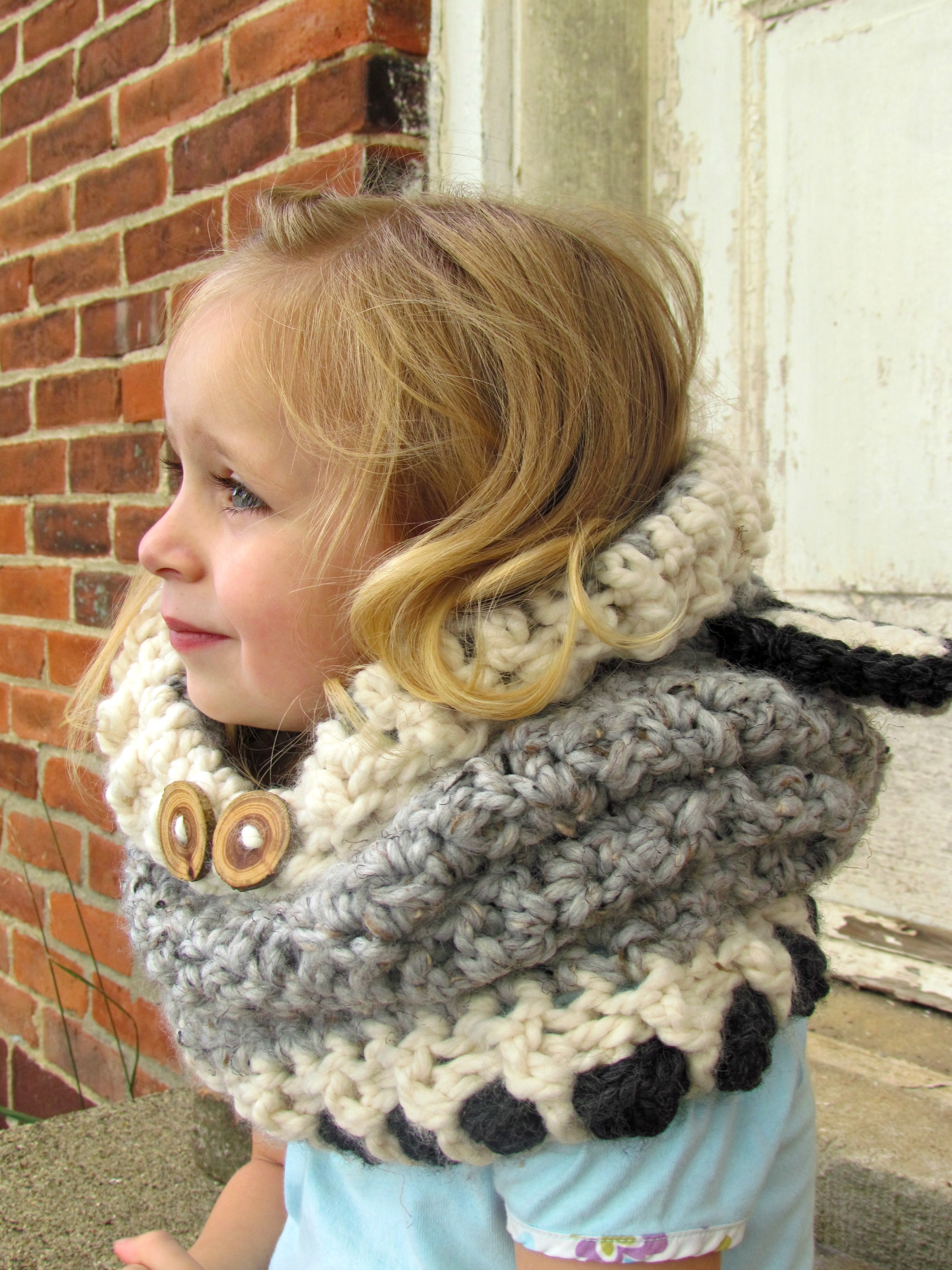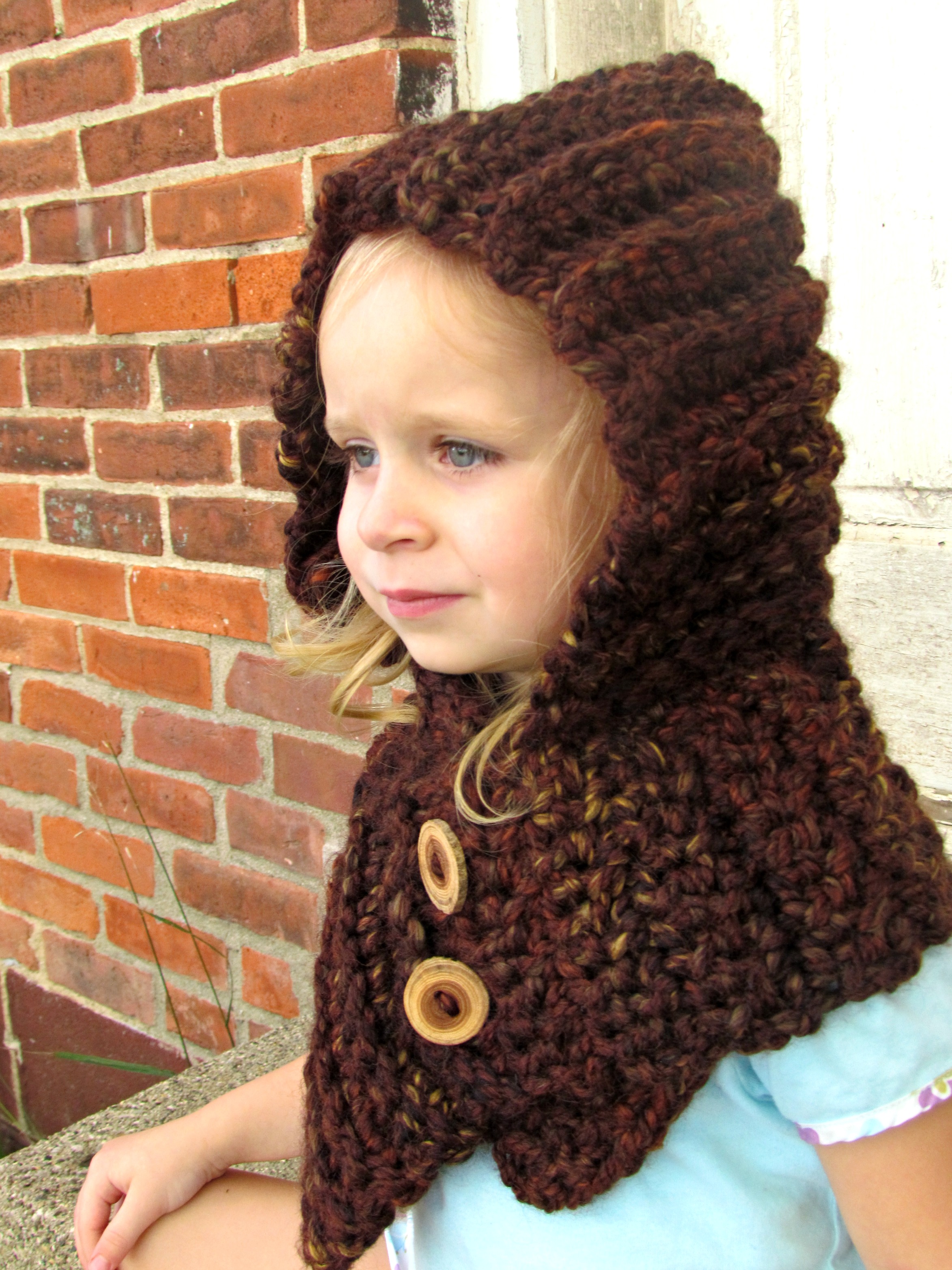 When standing before several aisles of yarn, you might think choosing just the right one for the project would be a challenge. In this case the opposite is true! I did consider going with a basic acrylic yarn for about…ummm, half a second. Then, my eyes were drawn to a selection of yarn that possessed richer coloring with greater depth and variation than anything else on the shelves. I reached out and gave those skeins a little squeeze. Ahhhh…”Luxury” was the word that came to mind. No scratchy, itchy stuff here! And it wasn’t ‘wimp-soft’ either. It was deliciously thick, and springy wool with just a whisper of acrylic in to make it snuggly soft. Considering the inherent warmth and wear ability of wool, combined with the visual appeal, and tenderness of the fibers, I knew this had to be your yarn! You are going to love how it worked up into these hooded cowls! They are going to keep your babies SO warm this fall/winter…and let’s not forget how stinking cute they’re going to look wearing them! 🙂